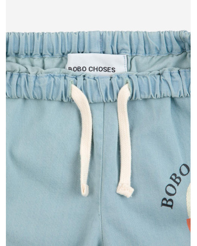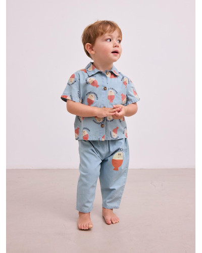 Light blue denim trousers with drawstring and morning egg print on the front.