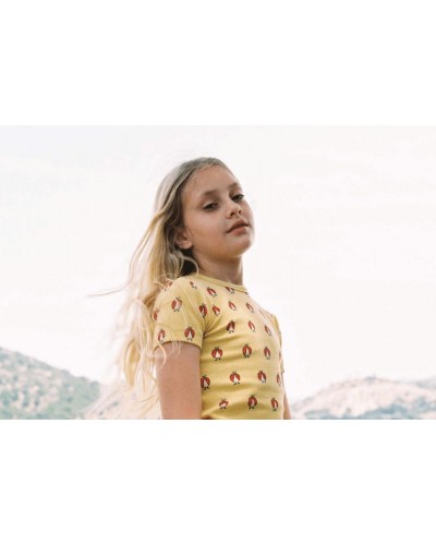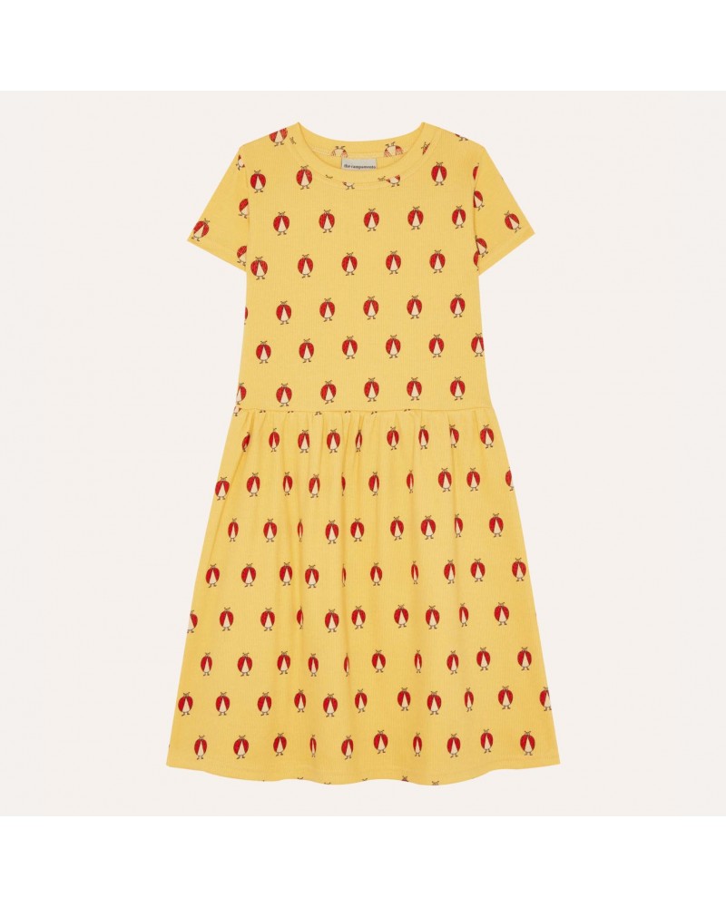 Yellow jersey dress with short sleeves and an all-over ladybug print.