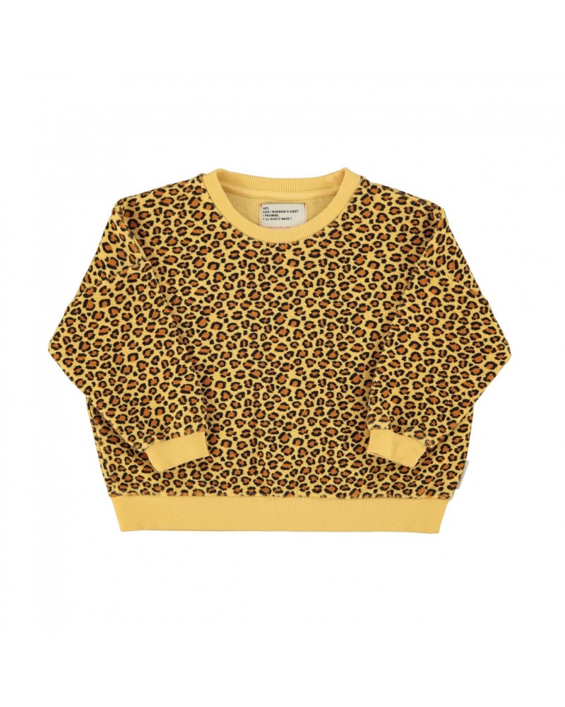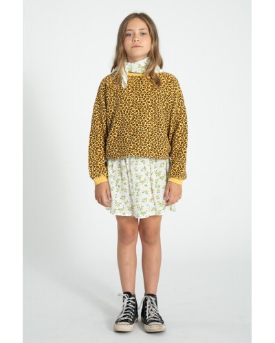 Mustard-colored sweatshirt with a leo spots print in organic fleece cotton.