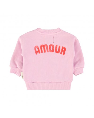 Soft pink sweatshirt with red heart front print and 'amour' text back print.