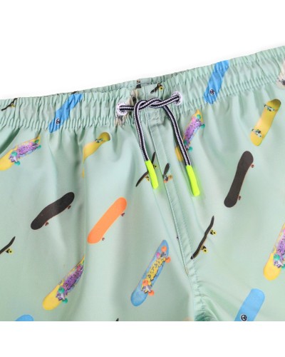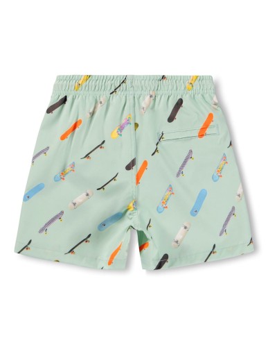 NIKO is a green swim shorts with skateboard print for active kids, made from recycled polyester with UV50+ protection.