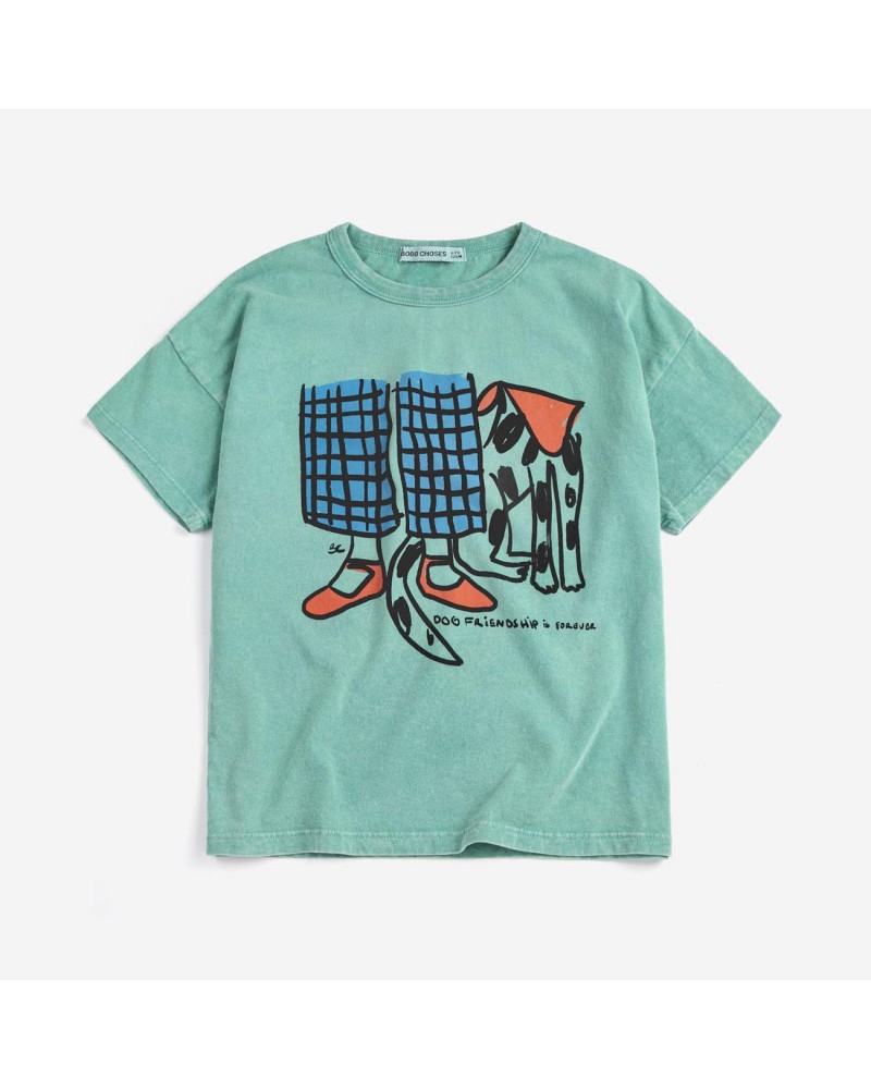 Green T-shirt with animal front print and text 'dog friendship is forever'
