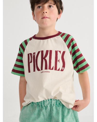 T-shirt with text print 'Pickles' in fun sneaky letters at front. The tee features short sleeves with fun green and lava red stripes.