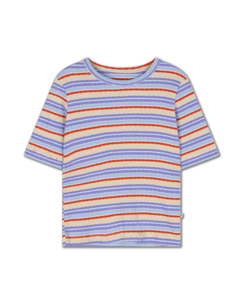 Multi glacier blue, coral and fresh yellow striped T-shirt.