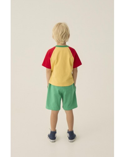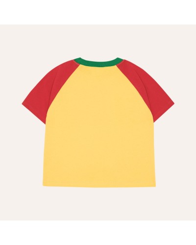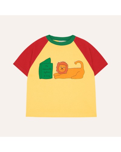 Red and yellow color block T-shirt with short sleeves and reading lion print.