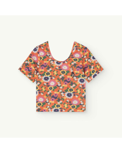 Orange top with short sleeves and flowers allover print.