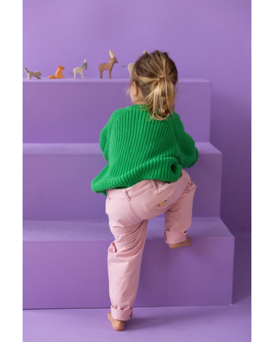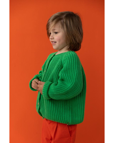 This unisex chunky knitted cardigan in apple green has an oversized design for a casual, fashionable look.