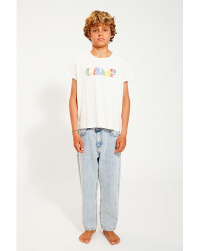 Ecru white T-shirt with 'CAMP' text print in multi-colored capital letters on the front.