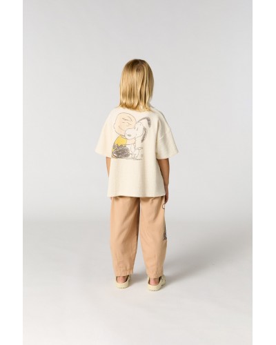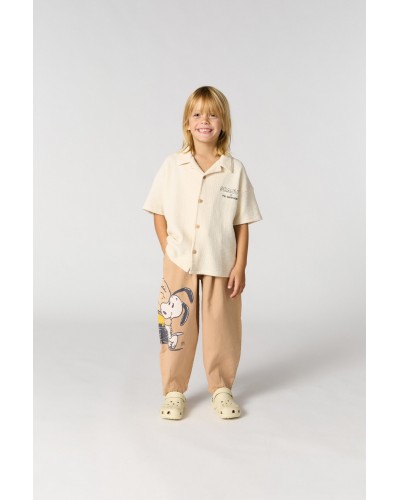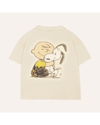 Ecru shirt in structure cotton with short sleeves. On the back is a big cute print of Snoopy and Charlie Brown.