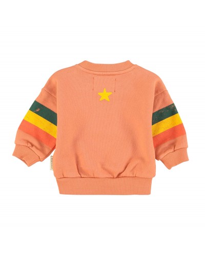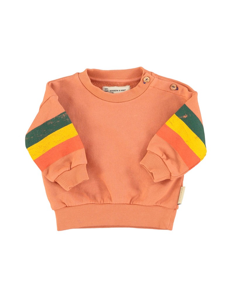 Perzik-oranje sweatshirt met veelkleurige strepen op de mouwen.