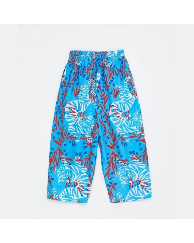 Prachtige blauwe broek met wildlife en tijgerprint in geweven katoen.