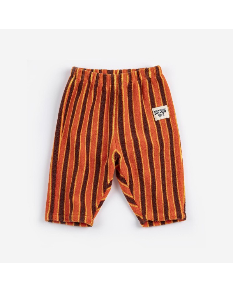 badstof broek met bruine en oranje strepen uit de baby en peuter collectie 'PICKLES' van bobo choses.