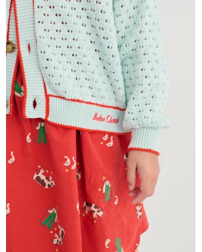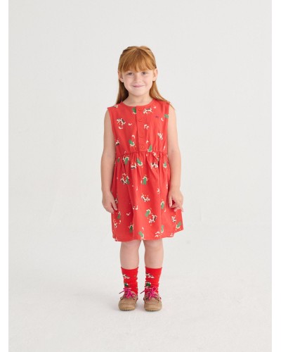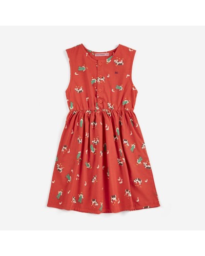 rode mouwloze jurk met koe en boerderij figuurtjes uit de collectie 'PICKLES' van bobo choses.