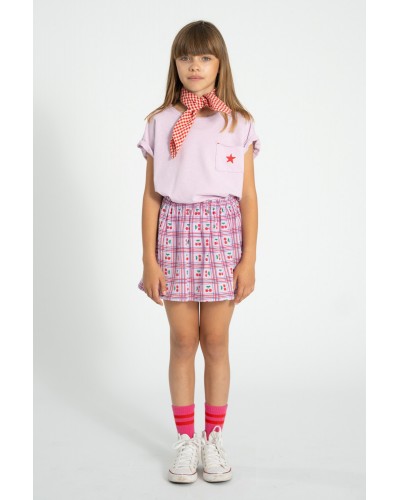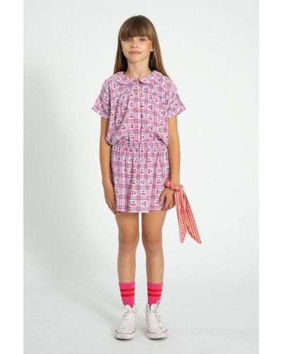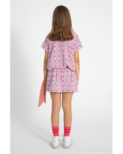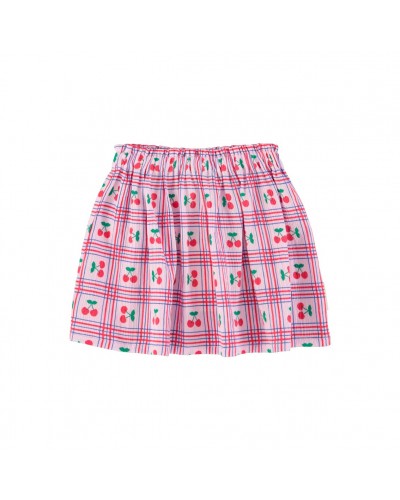 Roos geruit rokje in geweven katoen met kersjes allover print.