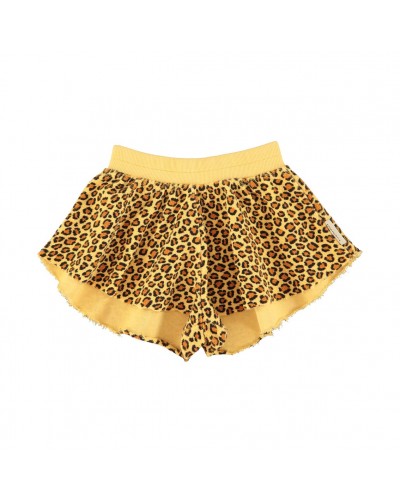 Mosterdgele short met dierenprint in biologisch katoenfleece.
