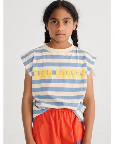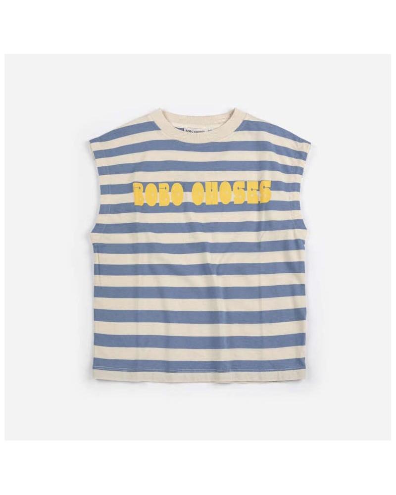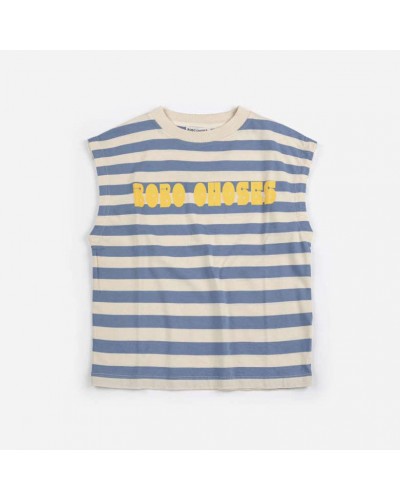 Mouwloze T-shirt met blauwe en ecru strepen.