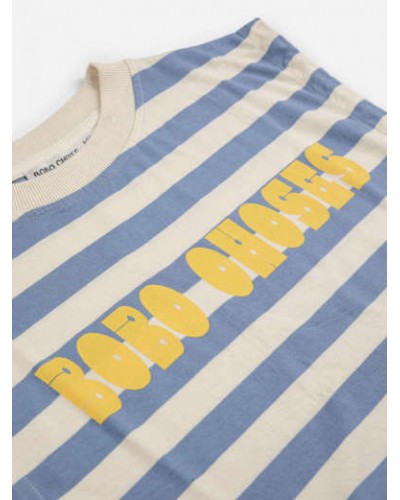 blauw gestreepte T-shirt met geel logo uit de collectie 'PICKLES' van bobo choses.