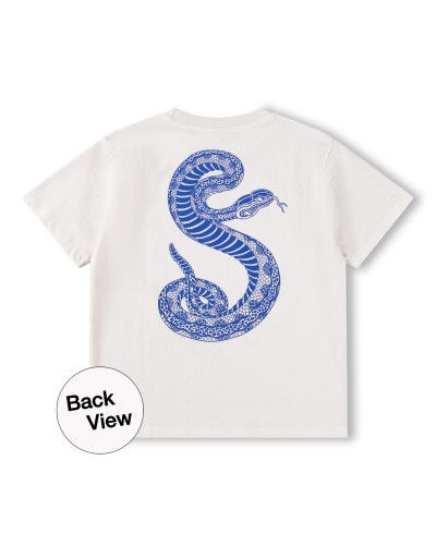 Witte T-shirt met op de voorzijde de print van een kleine blauwe slang en op de achterzijde een grote.