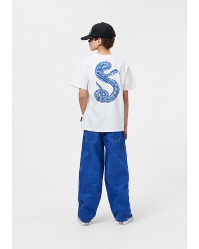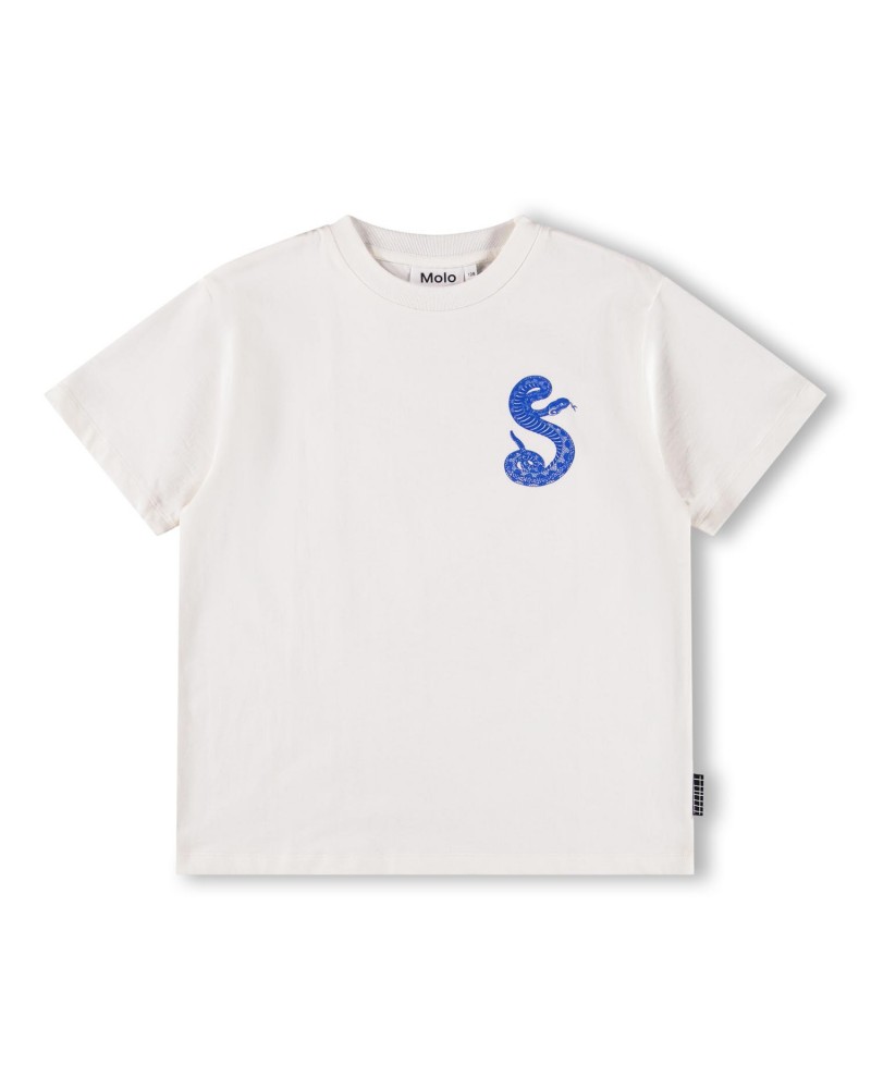 witte T-shirt met korte mouwen en blauwe slang in biokatoen van MOLO.