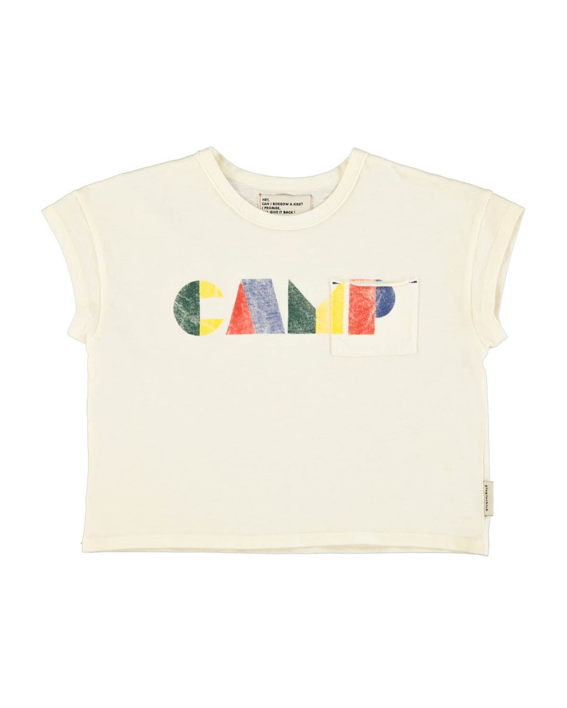 Ecru T-shirt met veelkleurige tekst print 'CAMP' op de voorzijde.