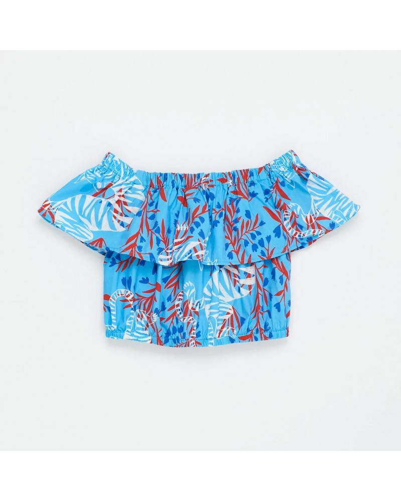 Prachtige blauwe off-shoulder blouse met volant in geweven katoen.