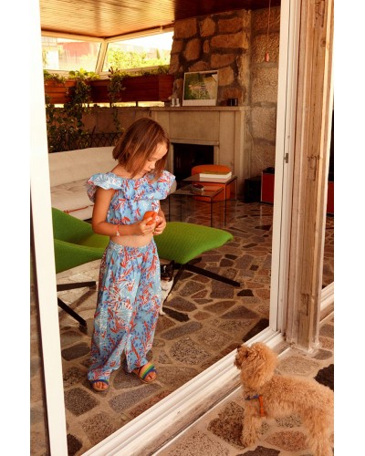De top heeft een allover print van wilde dieren, waaronder een Bengaalse tijger.